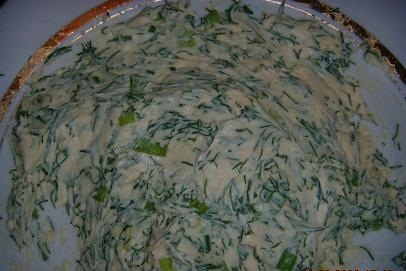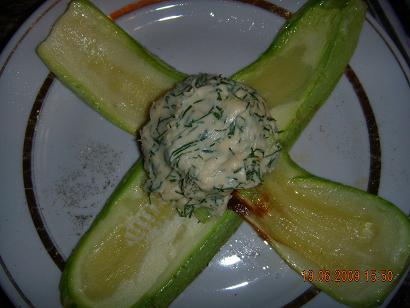 Сегодня купила очередной кулинарный журнал и наткнулась на замечательный рецепт кабачков. Самое удивительное, что при элементарном приготовлении получается необыкновенный вкус. Обязательно попробуйте! Это того стоит! Потребуется: 1 кабачок 2 плавленых сырка (в рецепте предлагалось взять 8 треугольничков сыра Hochland, я взяла 2 обычных сырка "Дружба") 2 зубчика чеснока 1 пучок укропа 0,5 пучка зеленого лука 1 чайн. ложка горчицы соль, перец. Чеснок очистить, мелко порубить. Зеленый лук нарезать колечками, укроп мелко нарезать. Сырки размять, смешать с луком, чесноком и укропом.