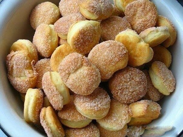 Никакого сахара или яиц в тесто не нужно, на полчаса в холодильник, потом раскатываем, рюмочкой выдавливаем - обваливаем в сахаре и выкладываем на противень. Печенье получается нежнейшее, кто сладкое не любит - макайте в кунжут, тмин, мак и прочие семена. И главное - его много выходит, этого печенья.