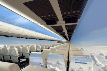 Разработка британского Центра инноваций в производстве стала возможна после появления криволинейных и гибких ЖК-экранов. Суть её в том, что вся внутренняя поверхность салона покрыта мониторами, транслирующими картинку с размещённых снаружи камер. При этом ближайшая к пассажиру часть такого «коллективного» монитора легко превращается в экран персонального ПК с сенсорным управлением, а остальные транслируют картинку, заставляющую поверить, что вы парите среди облаков без всякого самолёта. В общем, настоящее волшебство.