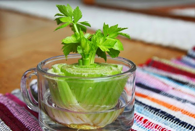 Отрежьте основание сельдерея и поместите его в блюдце с теплой водой на солнце. Листья начнут расти в середине основания, затем можно его пересадить.