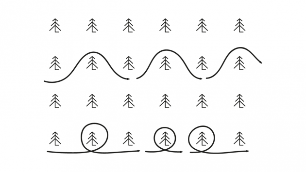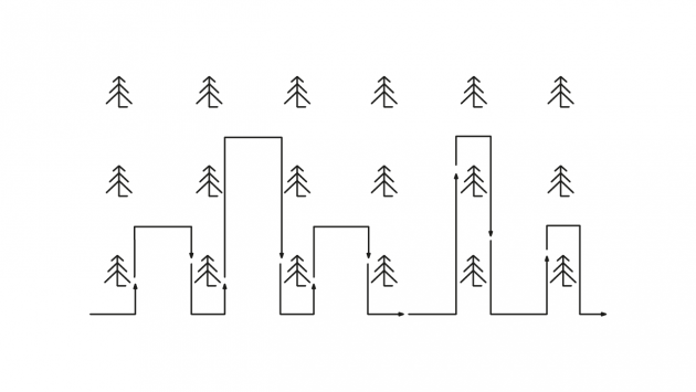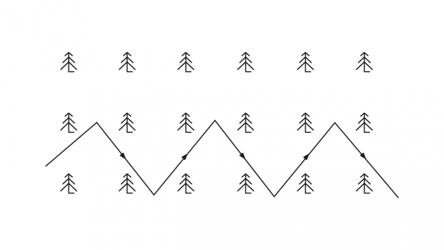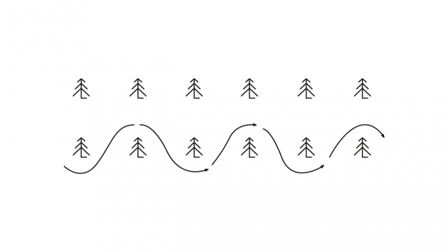 Ещё один способ поиска — волна, или зигзаг. Ходим так, если лес прозрачный, то есть деревьев мало.