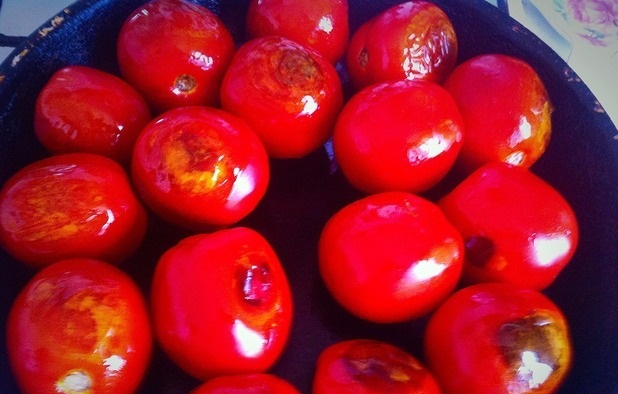 Помидоры надо помыть, обсушить и обжарить на растительном масле. Во время жарки накрыть крышкой. (У меня на поллитровую баночку ушло 9 шт. помидорок)    В стерилизованную банку кладем соль, сахар, уксус (на дно 2 ст.ложки и сверху 1 ст.ложку).