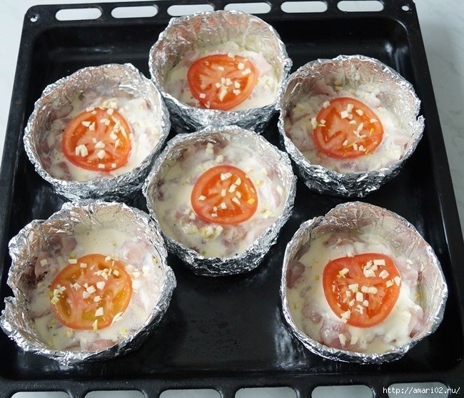 Для заливки в тарелку разбиваем яйца, добавляем майонез и взбалтываем. Поливаем курицу заливкой ( по 2 столовые ложки на порцию). если заливки не хватило, сделайте ещё одну порцию.