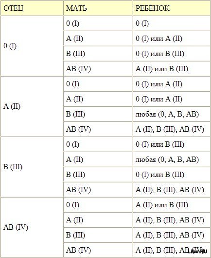 Группы крови наследуются по множественному принципу. Варианты проявления одного из генов равные и не зависят друг от друга. Попарное сочетание генов (А и В) определяет одну из четырех групп крови. В некоторых случаях по группе крови, возможно, определить отцовство.