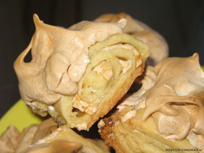 Оставшееся безе разложить сверху на каждый кусочек. Запекать, как обычно, минут 45, пока не подрумянятся.