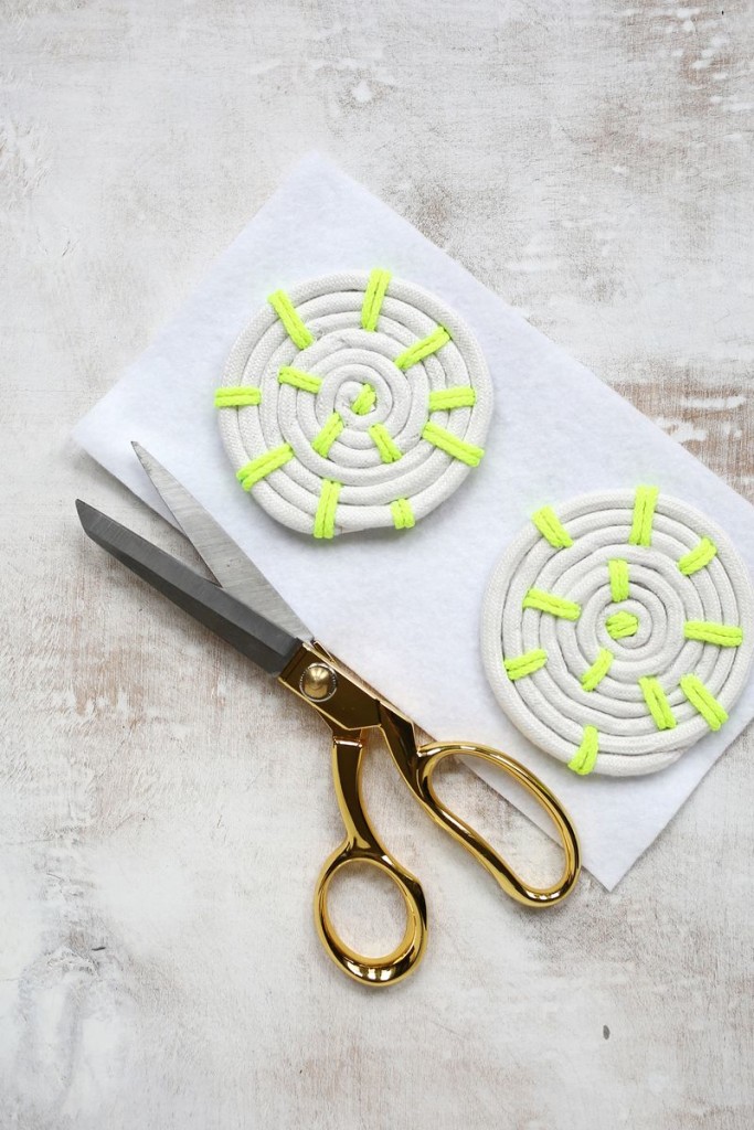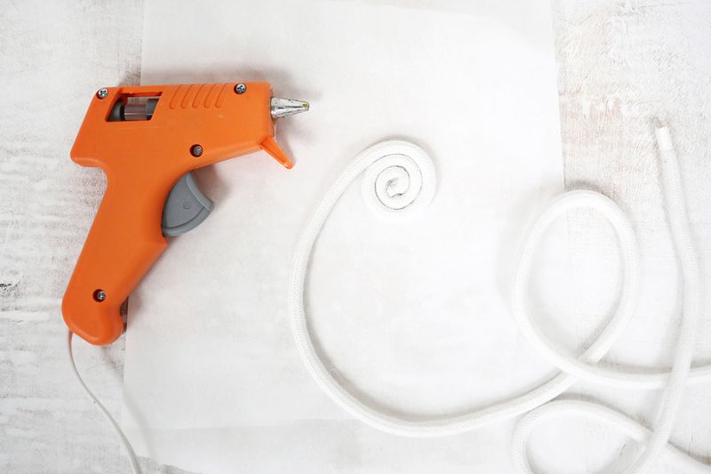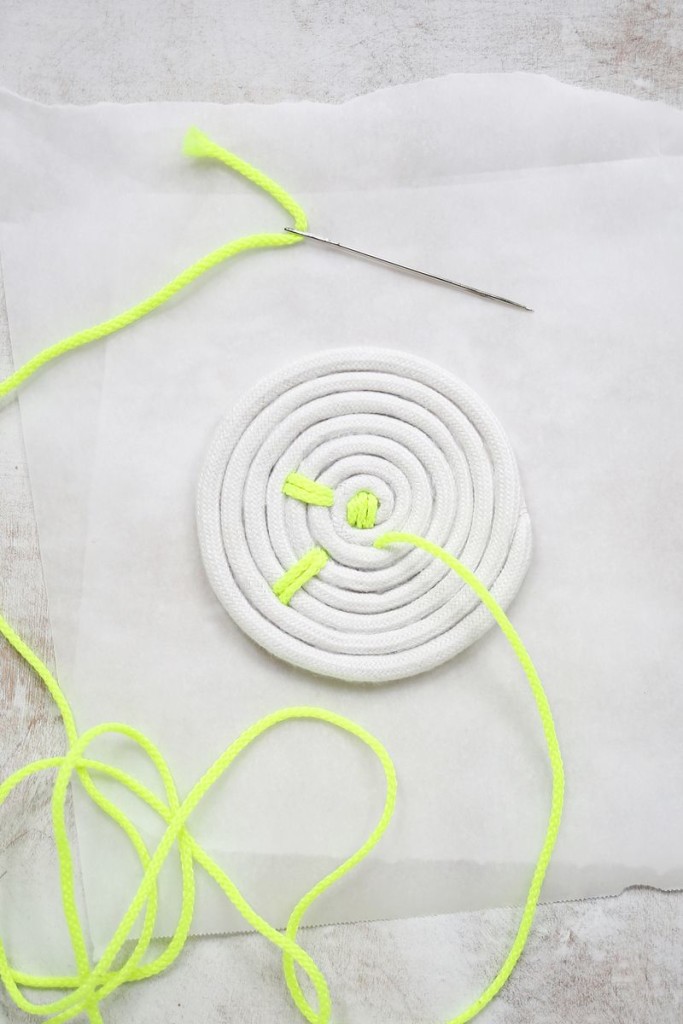 Скрутить плотно шнур, закрепив его в середине горячим клеем. Второй шнур контрастного цвета выполняет декоративную функцию.