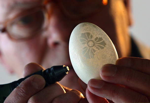 Прежде чем приступить к работе он непременно проверяет яйцо, чтобы в нём не оказалось ни одной даже микротрещины. Свои работы Гром продаёт, стоимость одного в среднем составляет 500 евро.