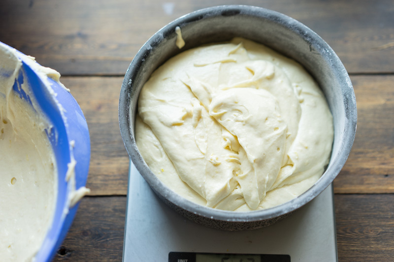 Выливаете половину теста. Чтобы точно понять, где половина — нужно заранее взвесить пустую чашку, а потом уже наливать в форму тесто на весах.