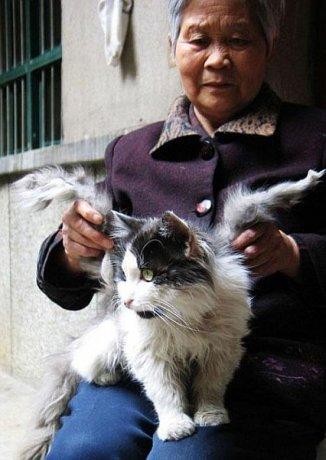 В Китае живет кот, у которого выросли крылья. Его хозяйка, пожилая женщина по имени Фенг из китайского города Сяньянг, только диву дается - обычный представитель семейства кошачьих неожиданно для всех обзавелся двумя отростками, длина которых составляет около десяти сантиметров. Причем крылья эти состоят из костей и делают животное, по словам его хозяйки, похожим на ангела.