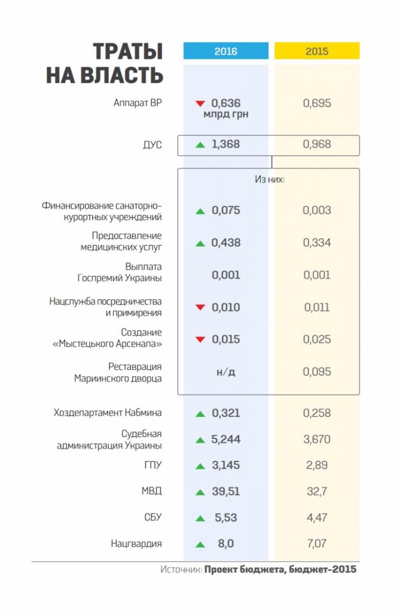 Траты на Госуправление делами подросли на 400 млн (см. инфографику): увеличился бюджет депутатской больницы «Феофания», содержание санаториев (их за ДУСей числится аж 17), ремонт Мариинского парка и дворца. Еще 34 млн планируют потратить на госрезиденции президента.