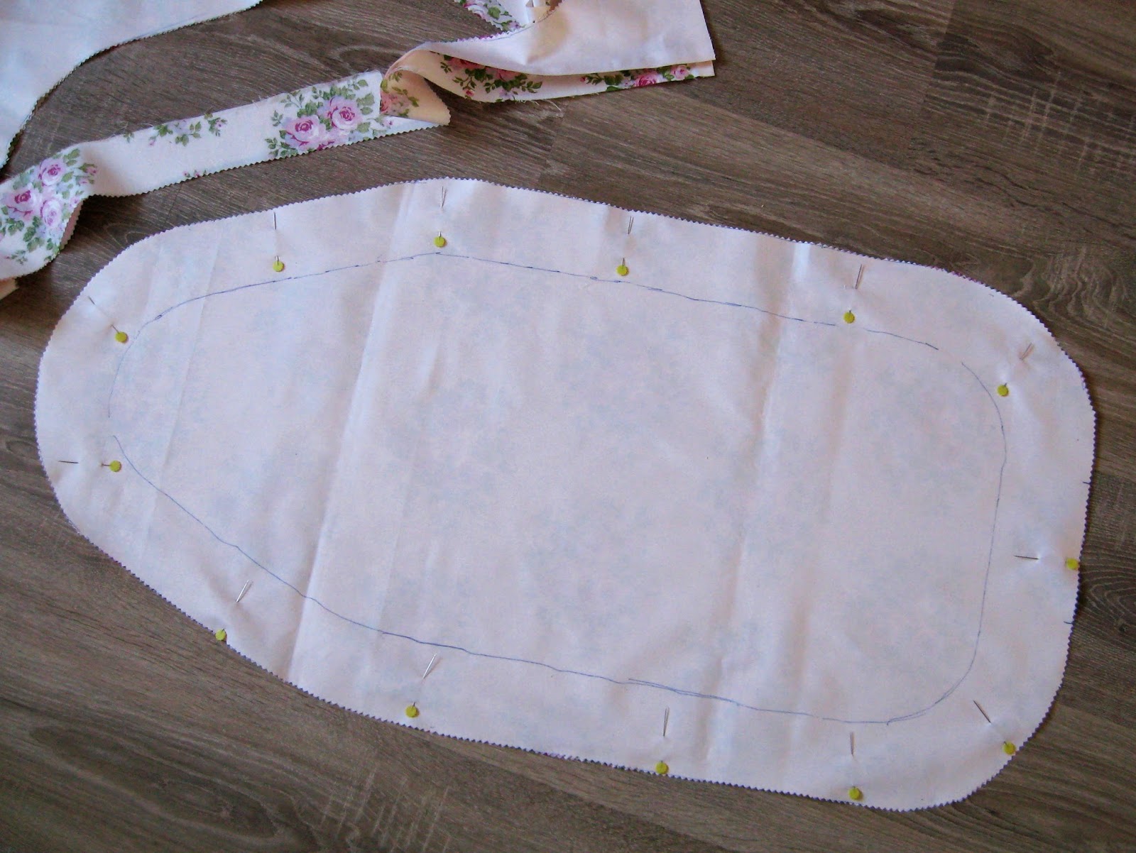 Скалываем два слоя ткани наметочными иглами и вырезаем по второй нарисованной нами линии. Я вырезала ножницами зиг-заг. Если у вас их нет, можно вырезать обычными ножницами, но после того как прострочим, надо будет на местах закруглений сделать насечки на ткани перпендикулярно шву.