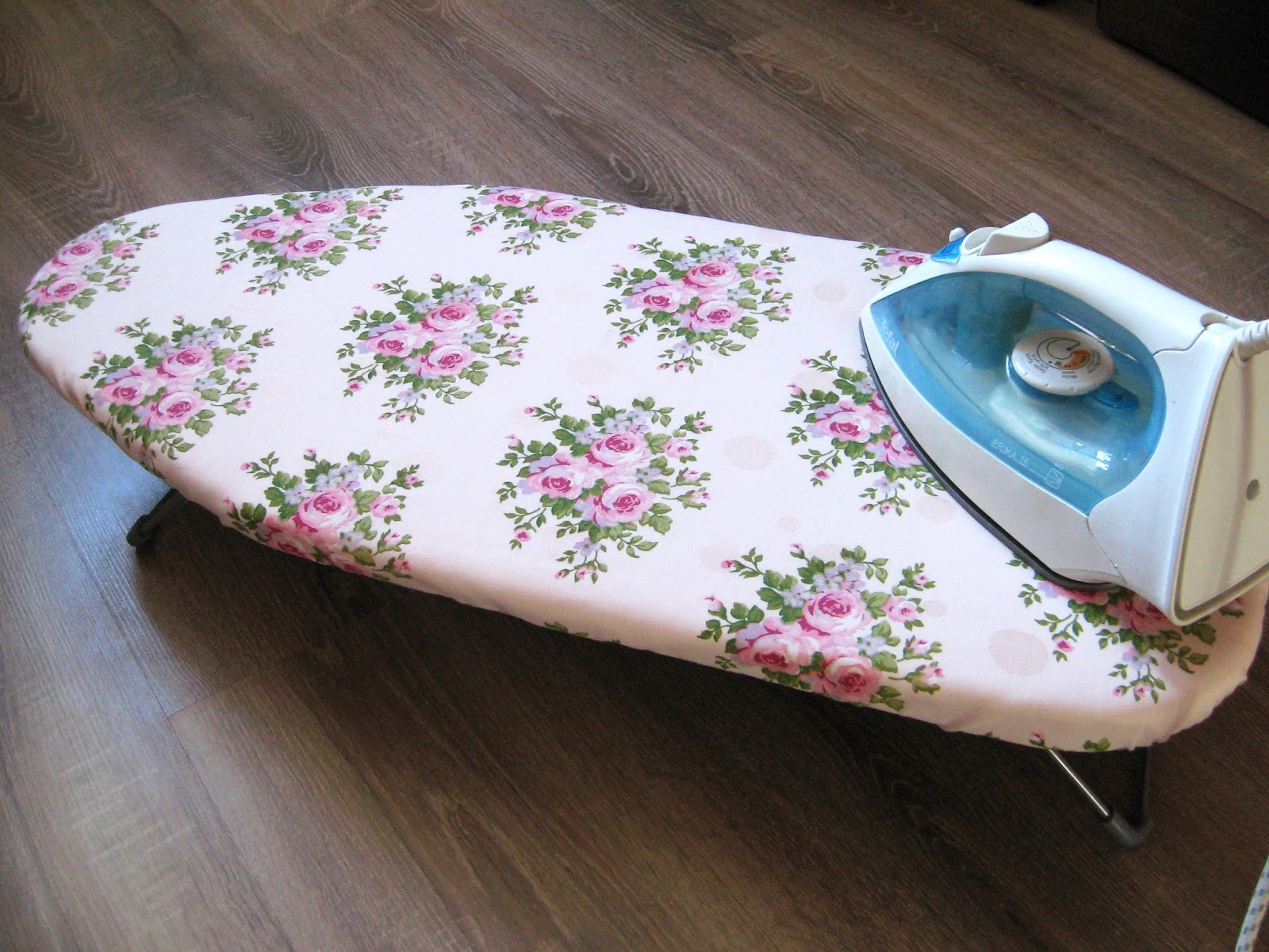 Вот моя гладильная доска и два отреза ткани, которые я подобрала. Нужно взять плотную ткань, которая не горит от самой горячей температуры утюга. Ткани берем с запасом на подворот.