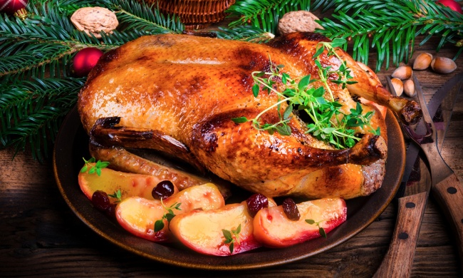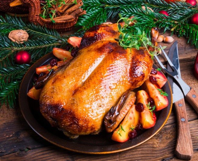 Для фарширования рождественской утки можно использовать не только яблоки. К ним можно добавить изюм, груши, курагу, дольки мандаринов или корицу.