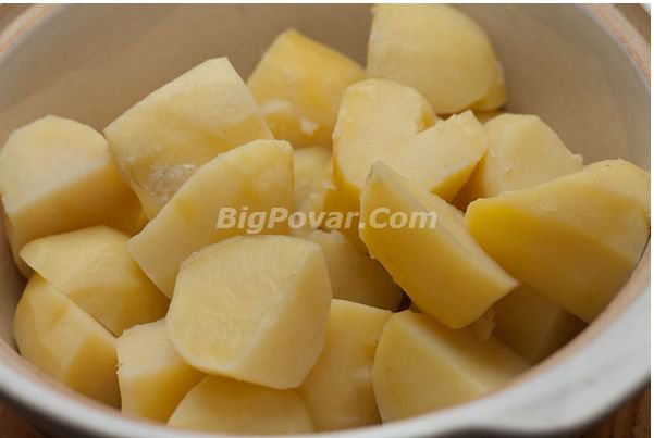 Очистите и отварите примерно килограмм картофеля в подсоленной воде.