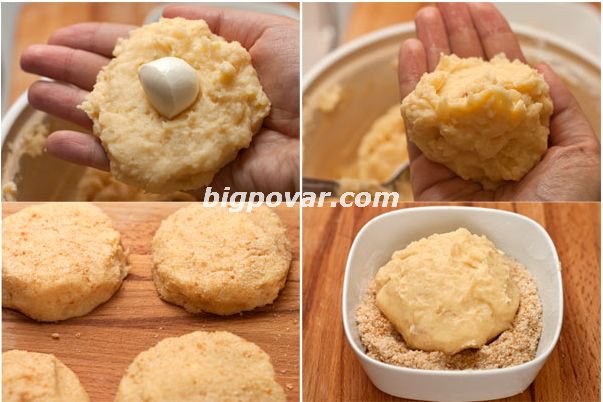 Лепить биточки лучше влажными или немного смазанными маслом, чтобы тесто меньше прилипало. Теперь берите по столовой ложке теста, делайте из нее лепешку, в середину кладите шарик (или ломтик) моцареллы. Залепляйте, обваливайте в панировочных сухарях со всех сторон, а затем формируй круглые «шайбочки».