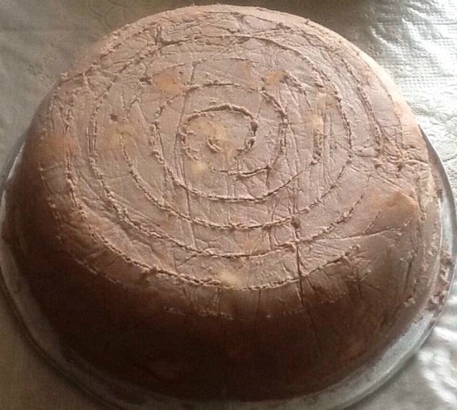 Перевернуть торт на блюдо. Застывший крем хорошо держит форму. Остается только проявить фантазию и украсить торт. Например, использоватьглазурь: тщательно смешать 3ст. л. сахара и 3 ст. л. какао. ; 50г сливочного масла полностью растворить на небольшом огне с 4 ст. л. молока, затем добавить смесь сахара и какао, хорошо перемешать, довести до кипения, но не кипятить. Остудить, набрать в шприц или мешочек и творить! Глазурь получается очень подходящей-в меру густая, не растекается, но и не застывает.