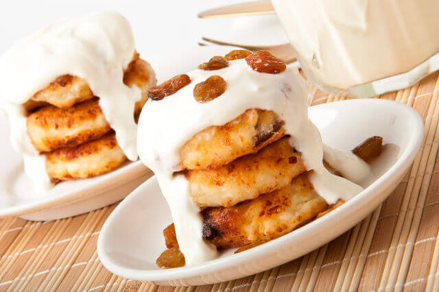 4. От сахара желательно отказаться, заменив его кусочками сладких груш, яблок или абрикосов. Отличным решением станет добавление в сырники измельченного миндаля, фундука или кешью. Некоторые кулинары предпочитают сухофрукты, в частности – изюм, предварительно замоченный в коньяке или горячей воде.