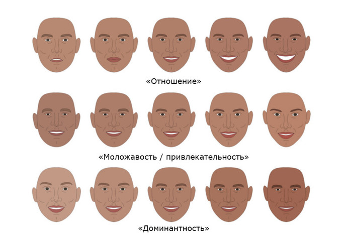 Ключевым фактором в оценке доброжелательности или злонамеренности оказалась улыбка – то есть выражение лица, которым мы хотя бы можем управлять. С двумя другими шкалами сделать что-то очень трудно. О «моложавости / привлекательности», как выяснилось, люди судят по глазам и области вокруг глаз. О доминантности – либо по маскулинным чертам, таким как форма челюсти, высота бровей или выраженность скул, либо по текстуре и оттенку кожи, которые ассоциируются с цветущим видом и здоровым загаром.