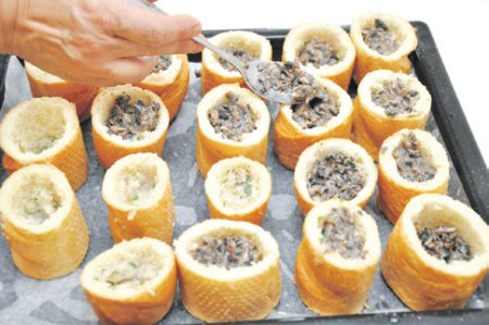- на бочонки положить грибной соус, сверху положить дольку помидора со сметаной и посыпать тертым сыром. Запекать в духовке при температуре 220° C 30 минут.