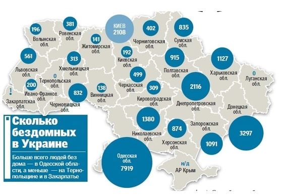 По подсчетам волонтеров, за два последних года бомжей в стране стало примерно на 20% больше из-за войны на Донбассе и аннексии Крыма. Сейчас, по данным Минсоцполитки, в стране насчитывается около 30 тысяч бездомных, но это лишь те, кто обратился за помощью. В реальности же, по оценкам экспертов, таковых — около 200 тысяч. И станет еще больше.