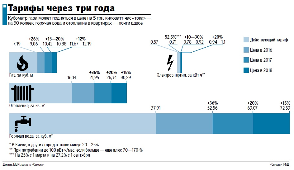 Что касается электроэнергии, то график повышения стоимости киловатт-часа уже составлен на год вперед, до марта 2017 г., и представлен НКРЭ: с 1 сентября 2016 г. минимальная цена киловатт-часа составит 71 коп. (при потреблении до 100 кВт-ч/мес.), максимальная — 1,64 грн (при потреблении свыше 600 кВт-ч/мес.). С 1 марта 2017 г. цена вырастет до 90 коп. и 1,68 грн соответственно. Год назад это составило бы 100% рыночной цены тока. Но с учетом инфляции в 2017—2018 гг. стоимость электроэнергии еще вырастет. Расчеты показывают, что при таких ценах и так недешевая "коммуналка" подорожает еще вдвое. И больше всего из кошельков украинцев "вытянет" тепло: за 2-комнатную квартиру в отопсезон придется заплатить порядка 1800 грн в месяц!