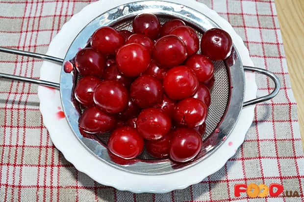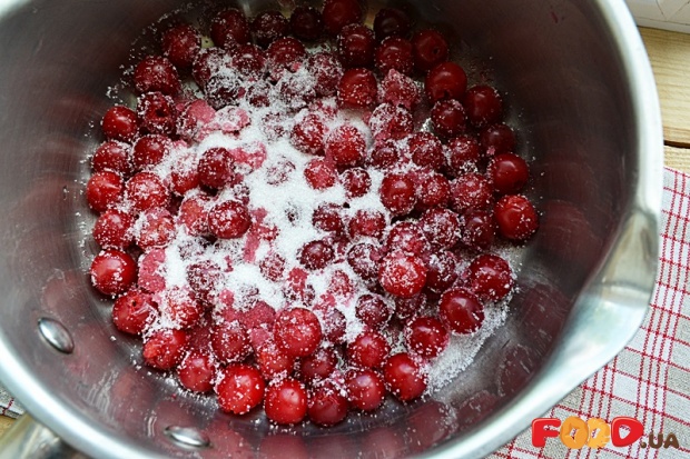 - вишня без косточки выложить в ковшик и засыпать сахаром. Оставить на час, вишня должна пустить сок.