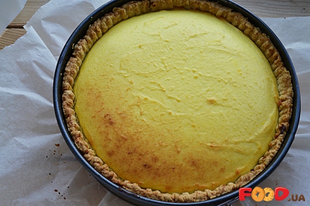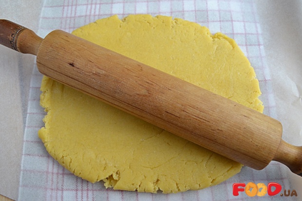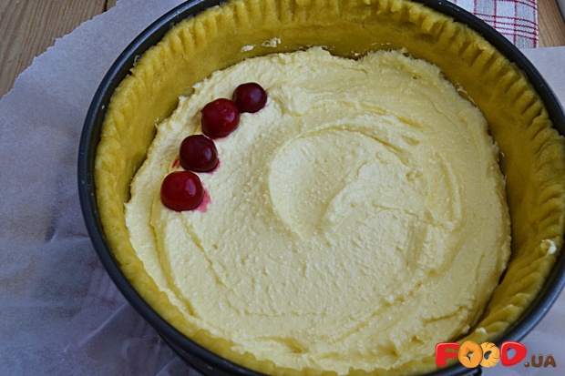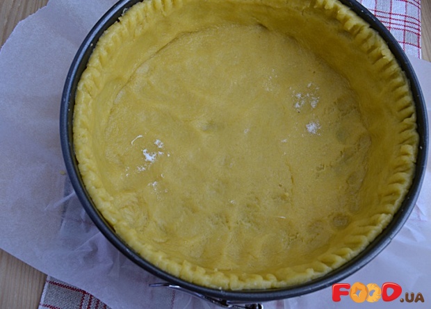 Выложить тестом дно и бока формы для пирога (диаметром 20 см), сформировав бортики.