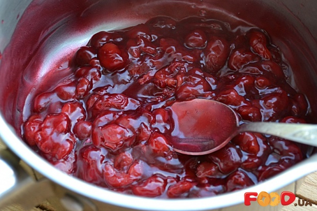 Затем добавить к вишне с сахаром вишневку (или воду) и довести до кипения, варить на медленном огне 15-20 минут. Крахмал развести в небольшом количестве воды и добавить к вишне, помешивая довести до кипения. Соус готов.
