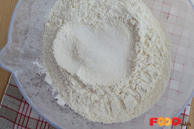 Муку просеять в миску, добавить щепотку соли и сахар.