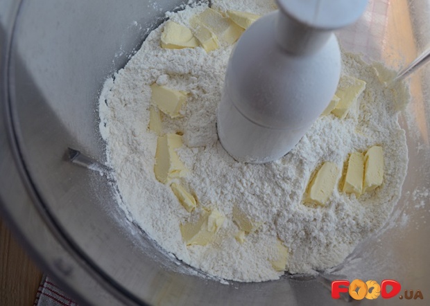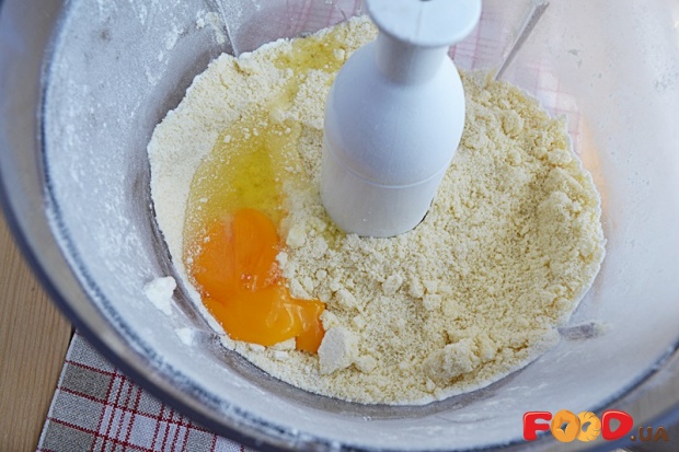 Масло с мукой измельчить в кухонном комбайне или порубить двумя ножами. Смесь должна напоминать мелкие крошки. Добавить яйцо, замесить тесто и скатать его в шар (тесто не должно липнуть к рукам).