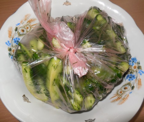 Теперь, осталось сложить их в обычный полиэтиленовый пакет и положить его на солнце (я кладу на подоконник) на полчаса. Под заготовку обязательно подставьте тарелку или миску, так как при засолке из огурцов будет выделяться сок, а в пакете может оказаться не заметная для глаза дырочка.