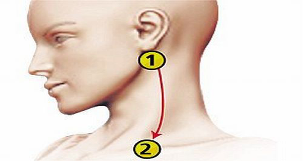 Это на самом деле линия, которая находится мочкой уха и продолжается до середины ключицы. Вам не нужно ее массажировать, но вы должны медленно нажать на нее кончиками пальцев сверху вниз. Вы должны это повторить 10 раз с обеих сторон.