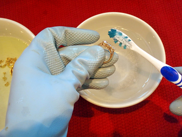 1. Возьмите любой кислородный отбеливатель (например, БОС) капните в него несколько капель моющего для посуды и залейте кипятком. Начнет активно образовываться пена – в нее и нужно поместить золотые украшения на 15-20 минут. После чего нужно почистить их зубной щеткой и тщательно просушить.