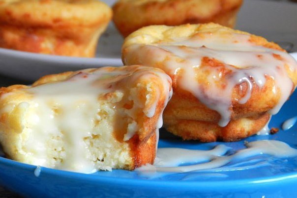 Творог растираем  с сахаром, яйцами и ванилином (или корицей) и разрыхлителем. Сюда же добавьте сливочное масло, сметану и манку. Тщательно перемешайте. По желанию можно добавить сухофрукты. Силиконовые формочки для кексов, смажьте маслом и выложите массу в них. Выпекайте до появления красивой золотистой корочки при температуре 180 градусов. Выньте из духовки, подождите пока остынут и вытащите из формочек. Подавайте со сметаной, вареньем.