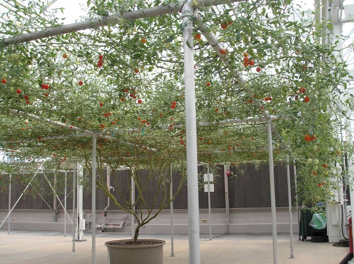Площадь кроны томата F1 Спрут достигает 40-50 кв. м. В кроне пасынкование не проводят, а дают цвести и плодоносить всем побегам.