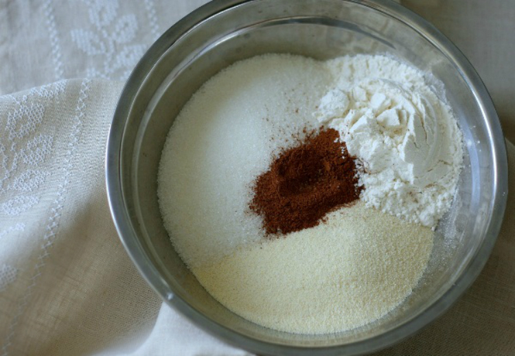 В отдельной посуде смешай все сухие ингредиенты: манку, муку, сахар, разрыхлитель, крахмал, корицу. Если любишьорехи, смело добавляй — не помешают!