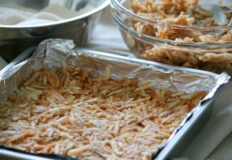 На дно формы насыпь часть сухой смеси толщиной примерно 0,5 см, разровняй. Сверху выложи такой же толщины слой тертых яблок, далее повтори очередность слоев, но последний должен быть из сухой смеси.