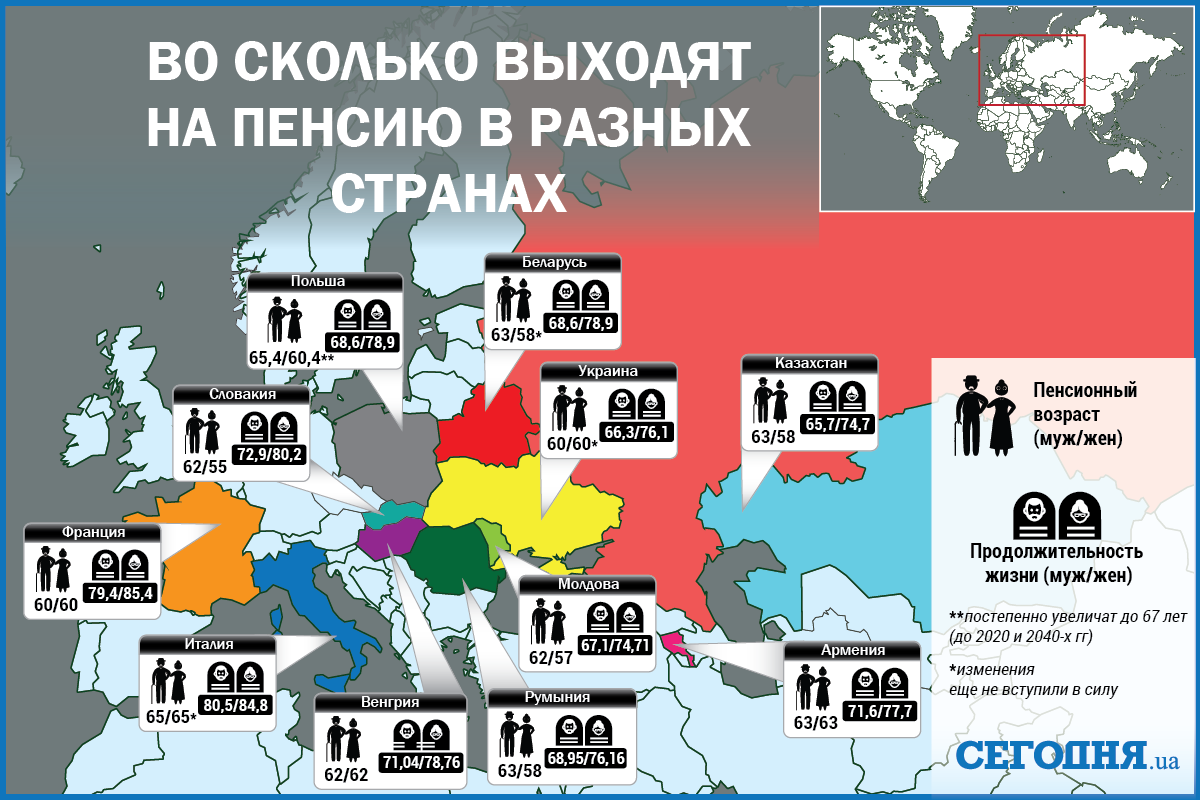 Возраст выхода на пенсию в странах Европейского союза в среднем – 65 лет (в Украине 57 для женщин и 60 лет). Еще в 2010-м году Еврокомиссия рекомендовала повысить пенсионный возраст до 70 лет. Уже сейчас немцы получают пенсию по возрасту с 67 лет. В Европе раньше всего на "заслуженный отдых" выходят украинцы, россияне и белорусы. В Беларуси, по решению правительства, мужчины будут выходить на пенсию в 63, женщины – в 58 лет.