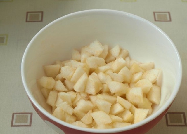 Нарезать кубиками груши, предварительно очистив их от шкурки.