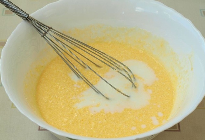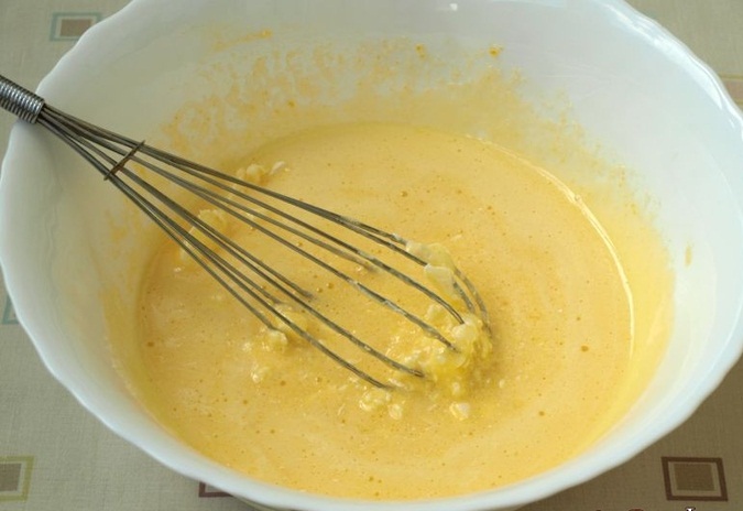 Взбить яйца с сахаром, используя венчик. Присоединить к яичной массе мягкое сливочное масло и ещё раз взбить.