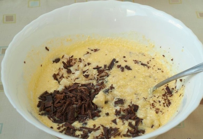 Настругать шоколад и добавить его в тесто. Также добавить нарезанные груши.