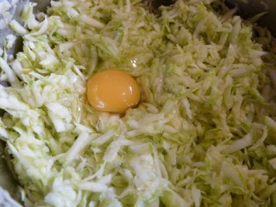 Кабачок почистить и натереть на терке. Лишнюю влагу отжать. Добавить яйцо, немного муки, посолить и перемешать.