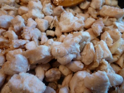 Куриное филе порезать маленькими кусочками, обжарить на растительном масле минут пять, посолить.
