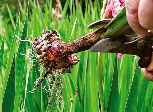 11. Выкопайте клубнелуковицы гладиолусов. В начале месяца срежьте отцветшие цветоносы. Выкапывание клубней проведите после первых заморозков. Очистите от земли, промойте в воде с марганцовкой, просушите (на протяжении месяца, в хорошо проветриваемом помещении) и поместите на хранение. Каждый сорт подпишите.