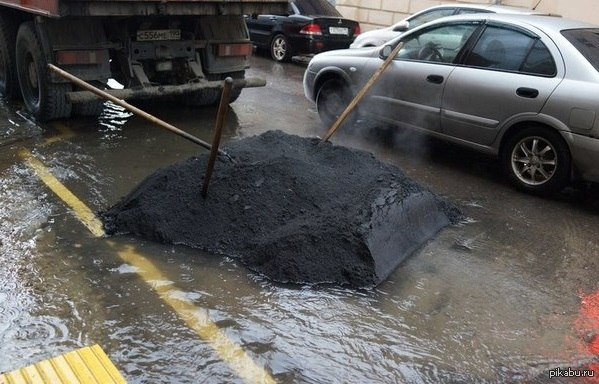 6) Ямочный ремонт если имеет место быть – допускается исключительно как временная и вынужденная мера. Выгрызание ямок и заделка их асфальтом должны быть сделаны за ОДИН день. При этом стенки и дно ямки в старом асфальте разогревают специальной горелкой, чтобы новый асфальт лучше прилип к старому. Через несколько недель участок дороги с заплатками полностью ремонтируют, сдирая асфальт до щебенки и укладывая новый. Стыки старого и нового участка прогревают специальной горелкой до пластичного состояния, чтобы не было заметно границы.