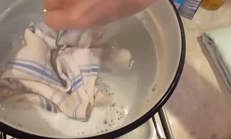 Смешайте все компоненты. Поместите в этот раствор полотенца. Выключите огонь. Накройте ведро крышкой.