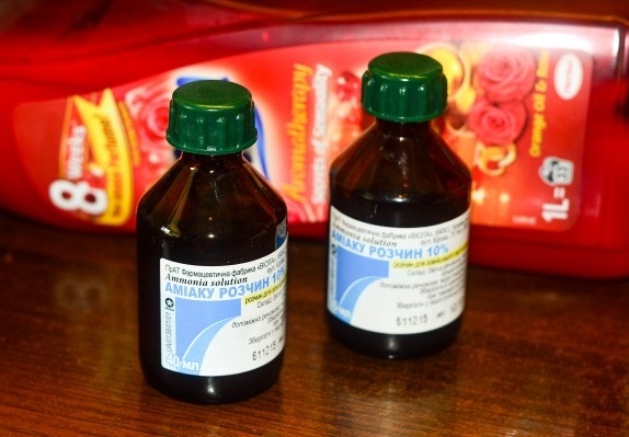 2. Берем 20 мл нашатырного спирта 10% консистенции и разбавляем в 5 л теплой воды. Замачиваем вещи одного цвета на 1-4 часа в этом растворе. Работаем в резиновых перчатках.