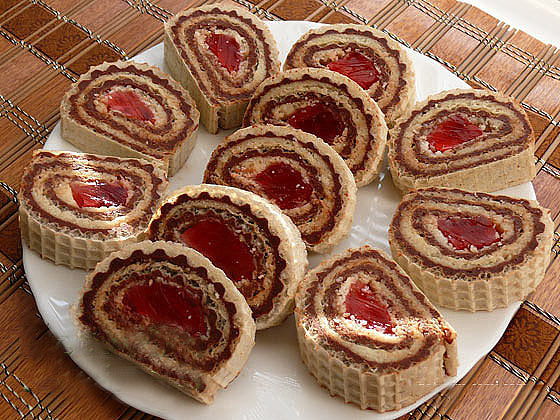 Потом намазать белый крем, вдоль положить полоски желе и скрутить в рулет. Положить в холодильник до полного застывания.