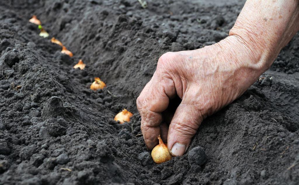 Для посадки подзимнего лука следует выбирать солнечное и сухое место. Сделайте грядки шириной 100 см и высотой 20 см. Очистите почву от сорняков и продезинфицируйте ее раствором медного купороса (1 ст.л. на 10 л воды). Затем выберите лук подходящего сорта, например, Центурион или Штутгартер. Луковички желательно выбирать первой категории (до 1,5 см в диаметре), или овсюжки (до 1 см в диаметре). Глубина посадки лука под зиму не должна превышать 3 см, иначе посадочный материал подгниет.