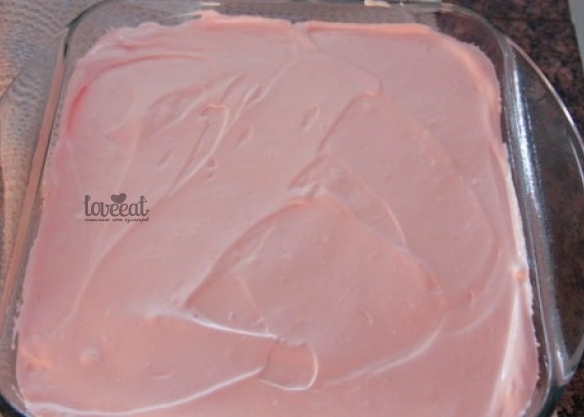 Во вторую добавьте немного красителя. И выложите его вторым слоем. Отправьте в холодильик на полчаса.